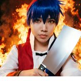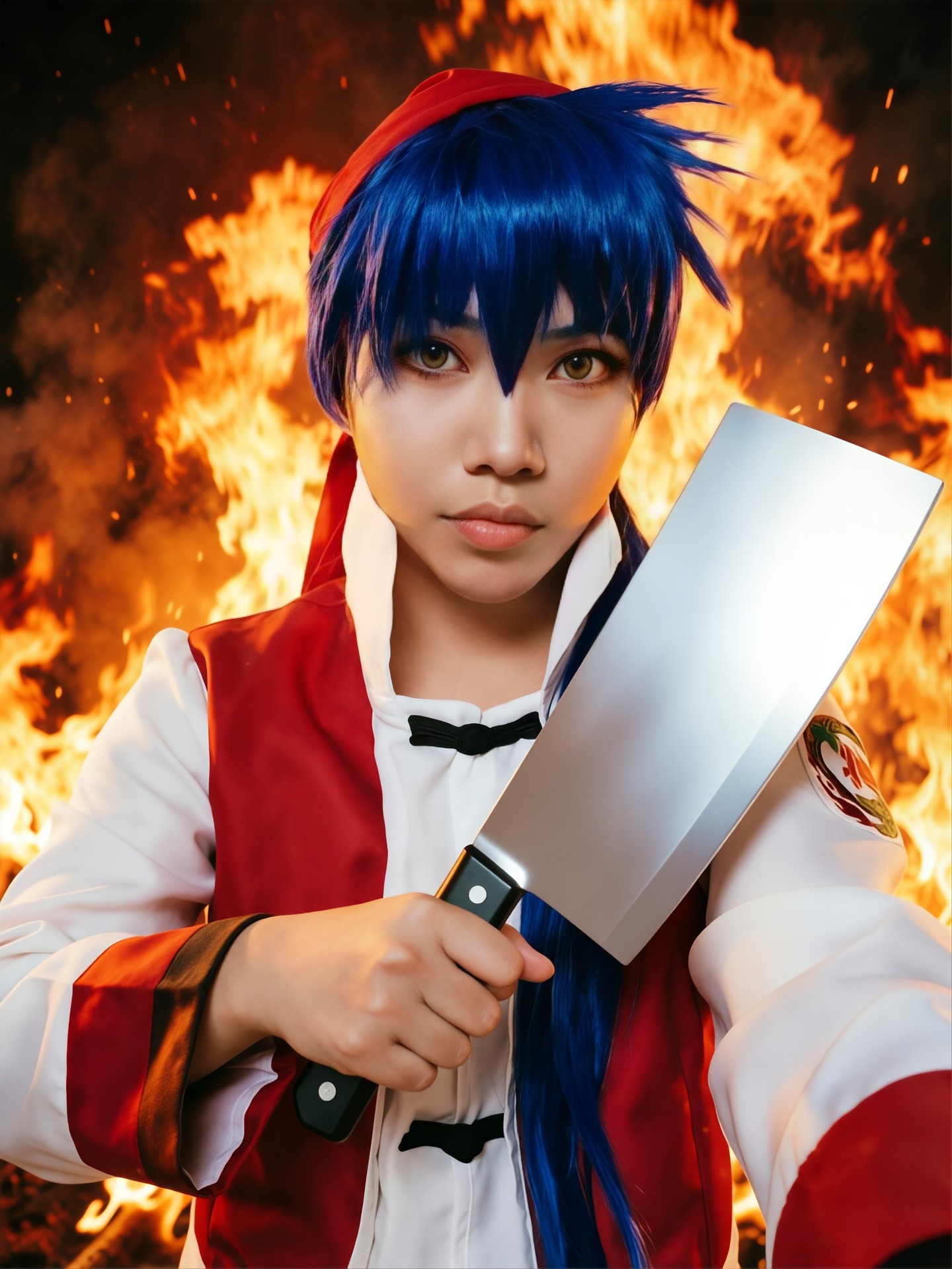 还原动画主角刘昴星(小当家)少年厨神造型,手持菜刀,背景添加火焰特效,十足的烟火气,效果直接拉满!